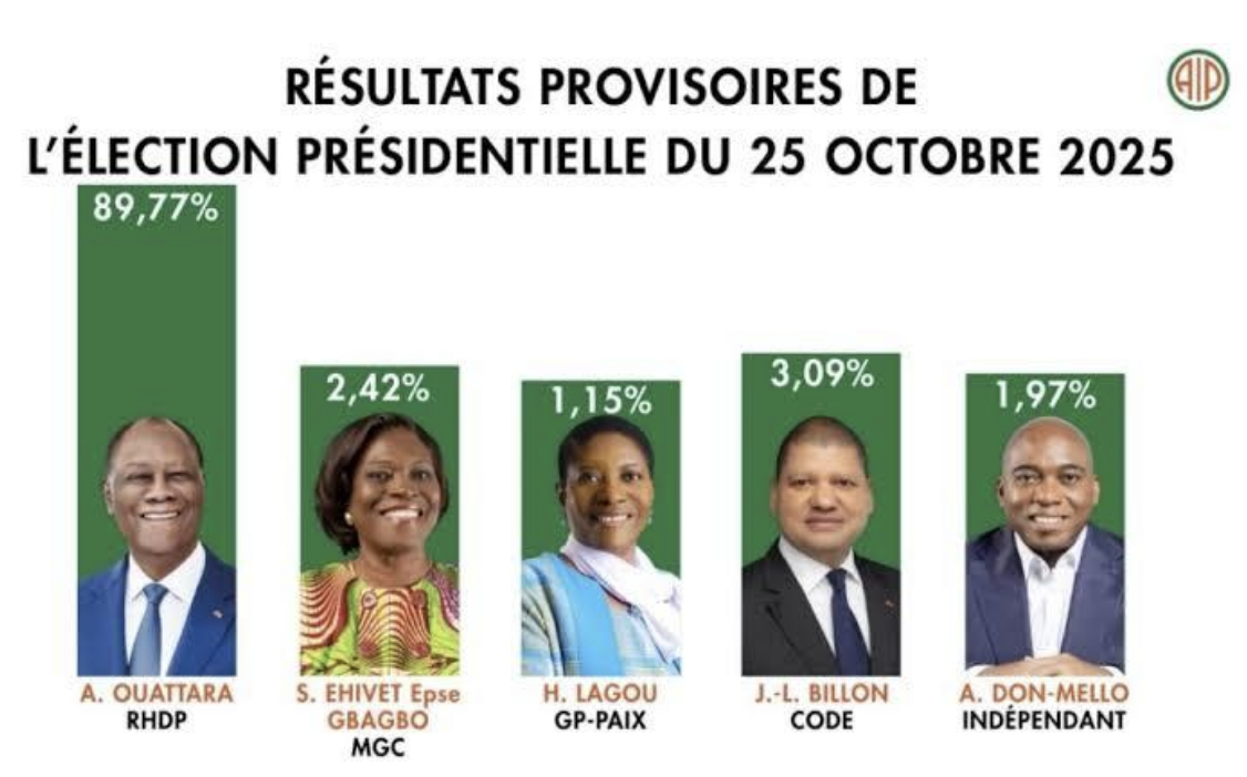 Le 25 octobre 2025, date du scrutin, a vu les élections se dérouler globalement dans le calme sur l’ensemble du territoire. Avec un taux de participation relativement faible de 50,10 %, le candidat Alassane Ouattara a été réélu pour un quatrième mandat présidentiel. Il remporte l’élection avec 89,77 % des suffrages exprimés, ses quatre adversaires se partageant 8,63 % des voix.