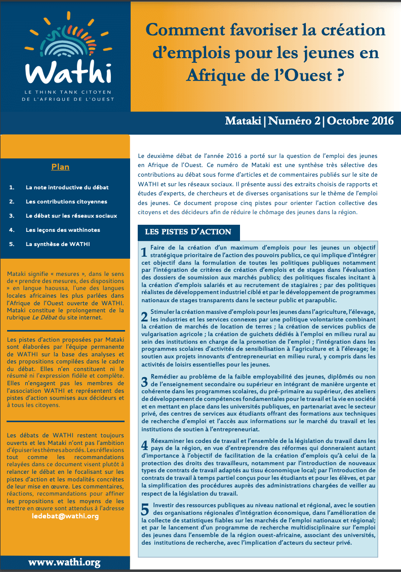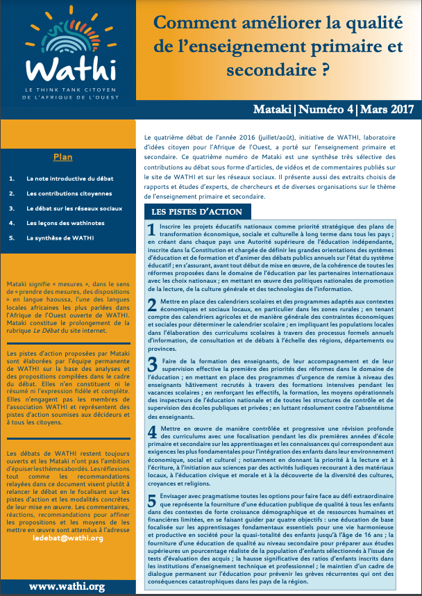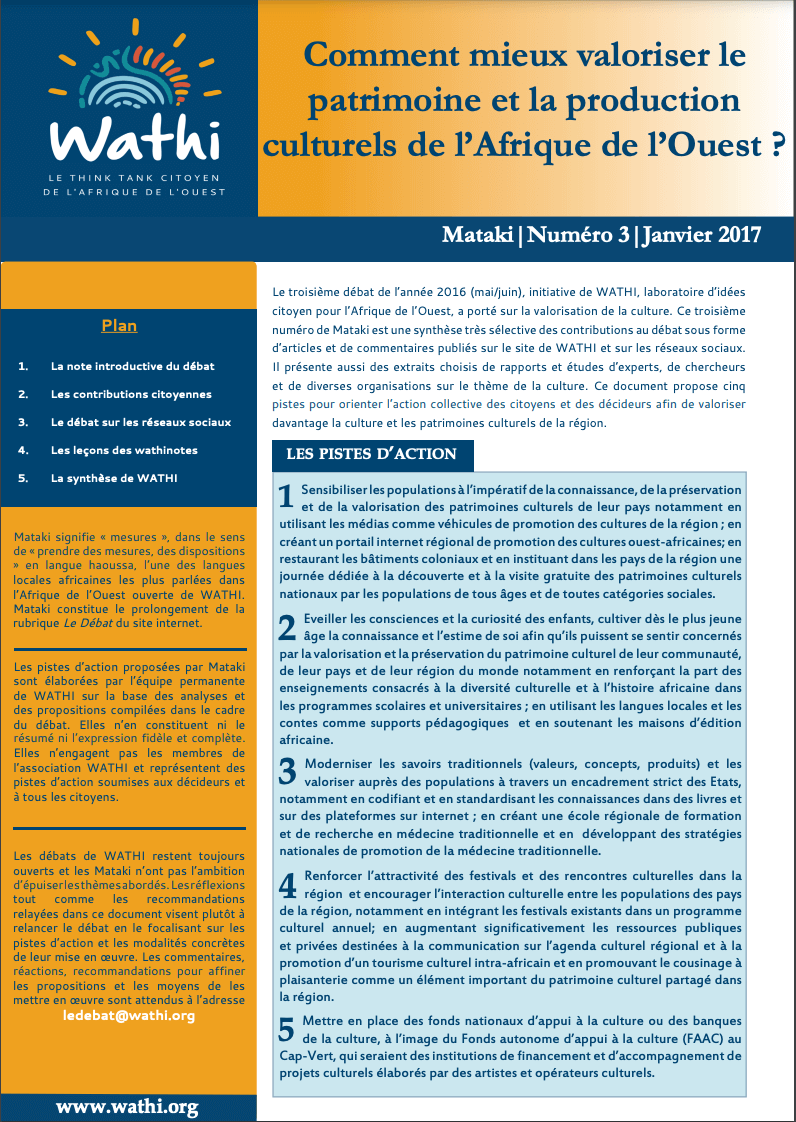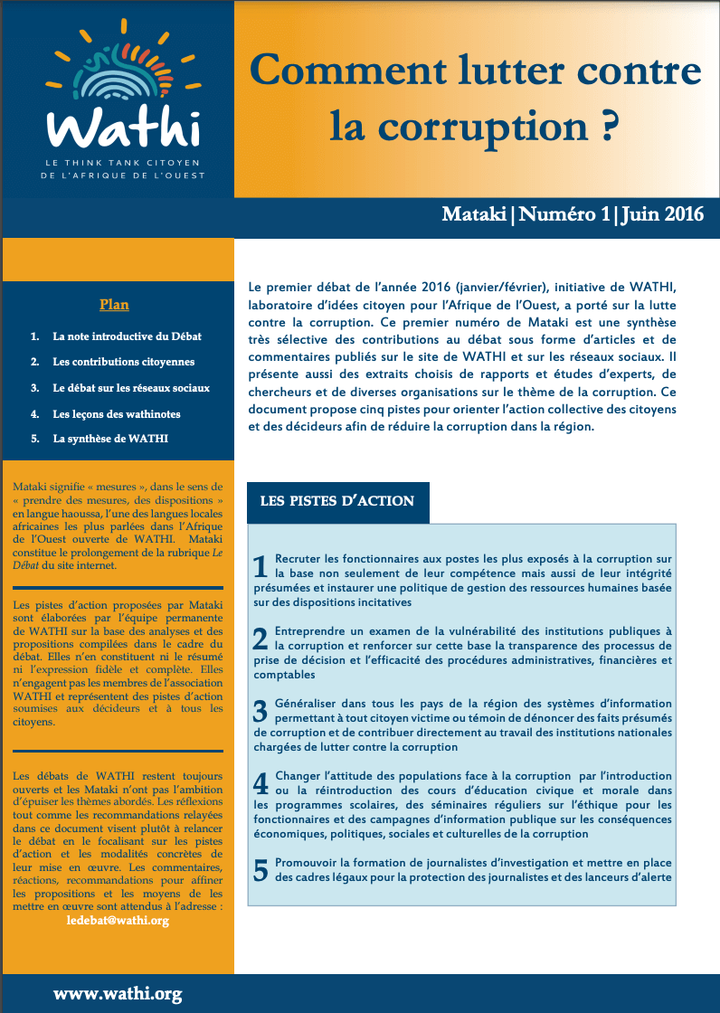 Mataki et WATHI5 sont deux publications préparées par WATHI à la suite de chacun des débats en ligne. Mataki signifie « mesures », dans le sens de « prendre des mesures, des dispositions » en langue haoussa, l’une des langues locales africaines les plus parlées dans l’Afrique de l’Ouest ouverte de WATHI.