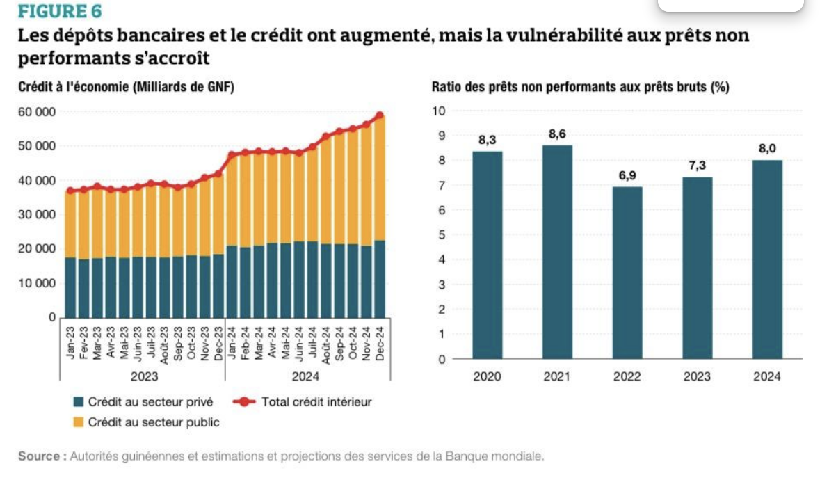 Le secteur bancaire demeure solvable, mais la vulnérabilité aux prêts non performants s’accroît. En septembre 2024, le ratio d’adéquation des fonds propres dépassait 15 %, bien au-dessus du minimum réglementaire de 10 %. Toutefois, la proportion de prêts non performants a légèrement augmenté pour atteindre 8,0 % du total des prêts en décembre 2024, contre 7,3 % en décembre 2023 (Figure 6, panneau de droite). Le ratio de provisionnement des prêts non performants s’établissait à 56 % en décembre 2024, contre 66 % l’année précédente. Le marché intérieur est demeuré dynamique, avec une hausse du crédit domestique de 41 % en glissement annuel en décembre 2024. Cette croissance est principalement attribuable à une augmentation de 56 % du crédit au gouvernement et de 22 % du crédit au secteur privé en glissement annuel (Figure 6, panneau de gauche). La forte hausse du crédit au gouvernement accroît l’exposition des banques commerciales au secteur public et pourrait potentiellement évincer le crédit déjà limité disponible pour le secteur privé.