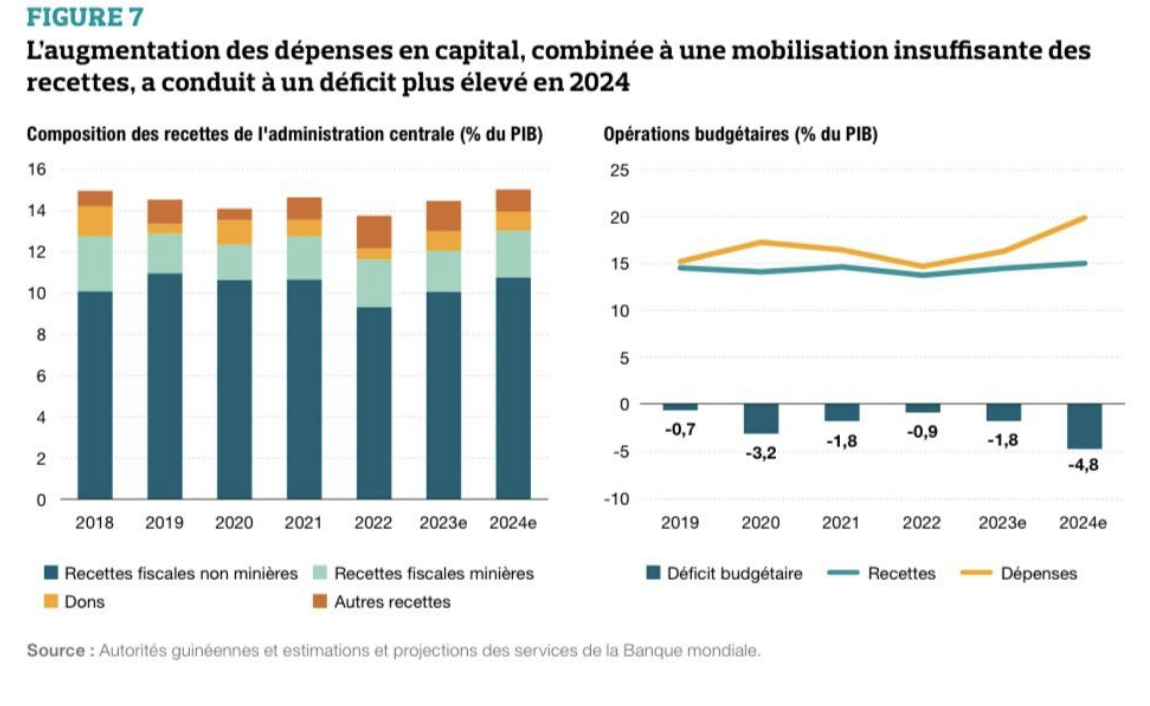Les recettes fiscales ont représenté en moyenne 12,3 % du PIB entre 2019 et 2023, avec des recettes minières à 2 % du PIB, représentant 16 % des recettes fiscales. En 2024, les recettes fiscales ont augmenté pour atteindre 13,1 % du PIB, contre 12 % en 2023, grâce à une augmentation des taxes à la consommation et des droits de douane, et les recettes fiscales minières ont également augmenté, atteignant 2,3 % du PIB, principalement en raison d’une production de bauxite plus élevée (Table 1). Cependant, les dépenses ont fortement augmenté pour atteindre 19,9 % du PIB en 2024, contre 16,3 % en 2023, en raison de dépenses en capital plus élevées, qui sont passées à 8,2 % du PIB contre 4,9 % en 2023. En conséquence, malgré l’augmentation des recettes fiscales, le déficit budgétaire a augmenté pour atteindre environ 4,8 % du PIB en 2024, contre 1,8 % (Figure 7).
