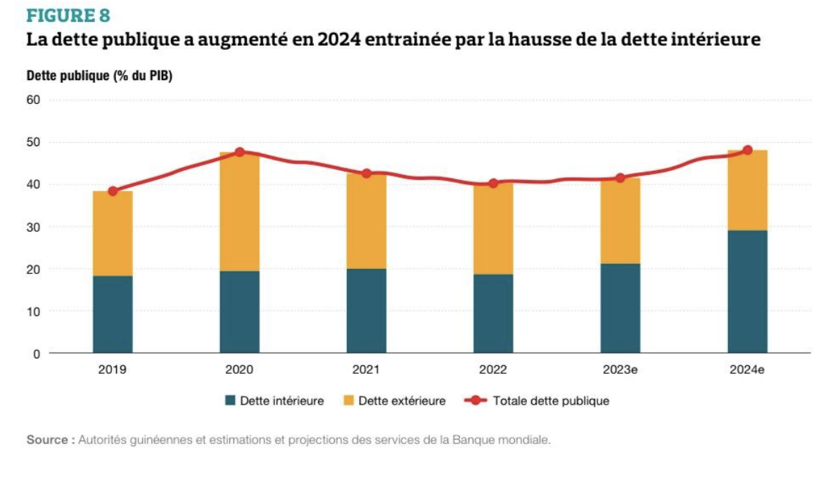 La dette de la Guinée a augmenté, avec un recours croissant à des emprunts moins concessionnels sur le marché local. En 2024, la dette publique en pourcentage du PIB a augmenté pour atteindre une estimation de 48 %, contre 41,4 % en 2023, en raison d’une augmentation de l’émission de dette intérieure pour financer les investissements dans les infrastructures publiques (Figure 8). À la fin de 2024, la dette publique extérieure était estimée à 18,9 % du PIB, dont la moitié était la dette multilatérale, tandis que la dette intérieure représentait 29 % du PIB (contre 21,1 % en 2023).