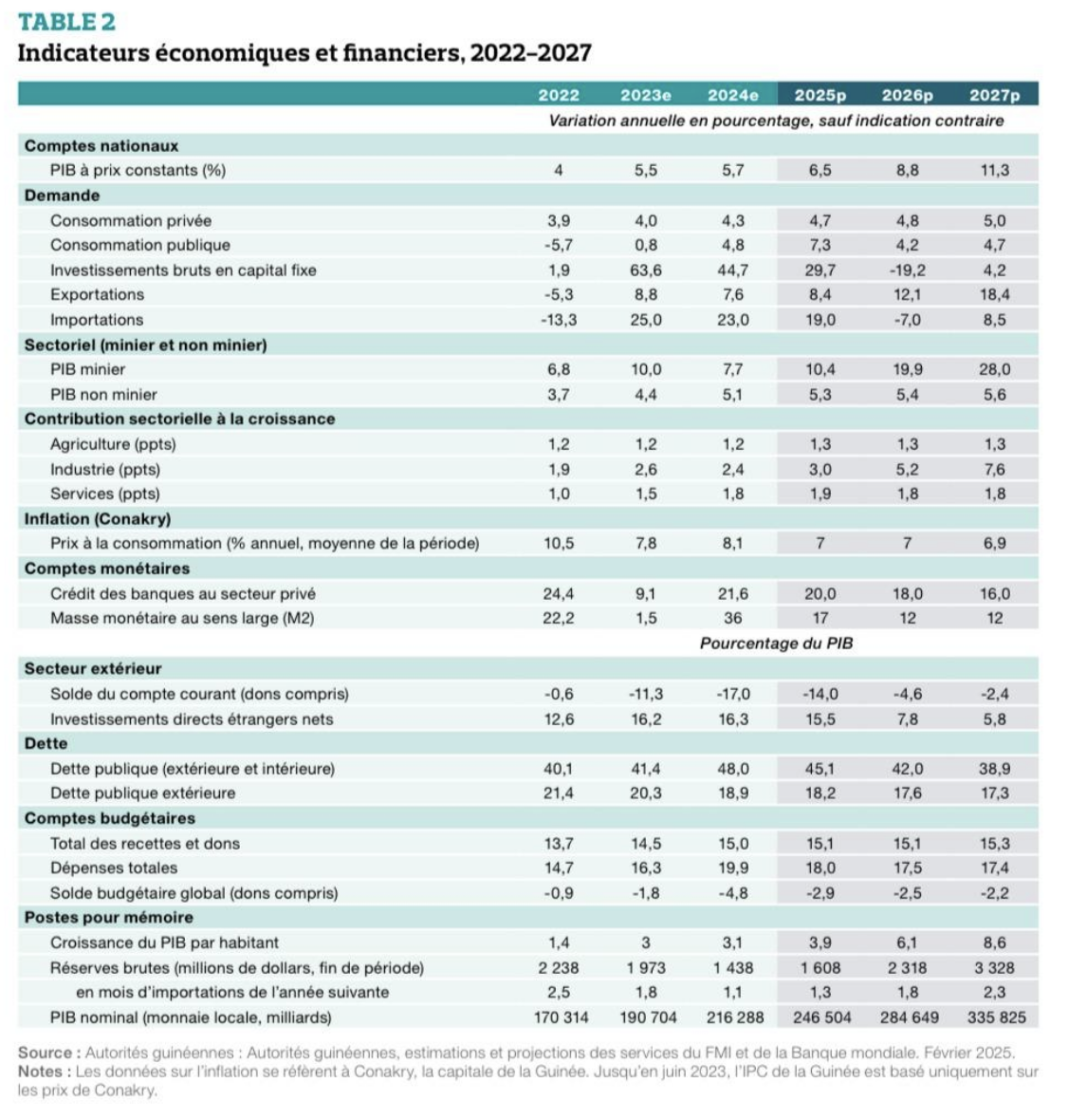 Malgré les incertitudes à l’échelle mondiale, la croissance de la Guinée devrait atteindre deux chiffres à moyen terme, principalement grâce au démarrage de l’exploitation du minerai de fer de Simandou. La croissance devrait atteindre 6,5 % en 2025 (3,9 % par habitant) et 10 % en moyenne en 2026-2027 (7,4 % par habitant), principalement grâce au secteur minier (Table 2). Cette prévision est supérieure de 0,3 point de pourcentage en 2025, de 0,1 point en 2026 et de 0,2 point en 2027 par rapport aux projections avant l’adoption des nouvelles mesures tarifaires par les États Unis. L’ensemble des impacts économiques de l’incertitude récente de la politique commerciale mondiale est dynamique et difficile à évaluer. Les tarifs américains devraient avoir un impact direct limité sur la Guinée, puisque seulement 0,1 % de ses exportations sont destinées aux États-Unis.