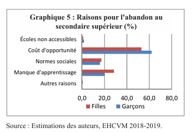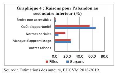 Le manque d’apprentissage contribue également aux abandons, et pour les filles, la question des normes sociales est également importante en raison des risques de mariage et de grossesse précoce.