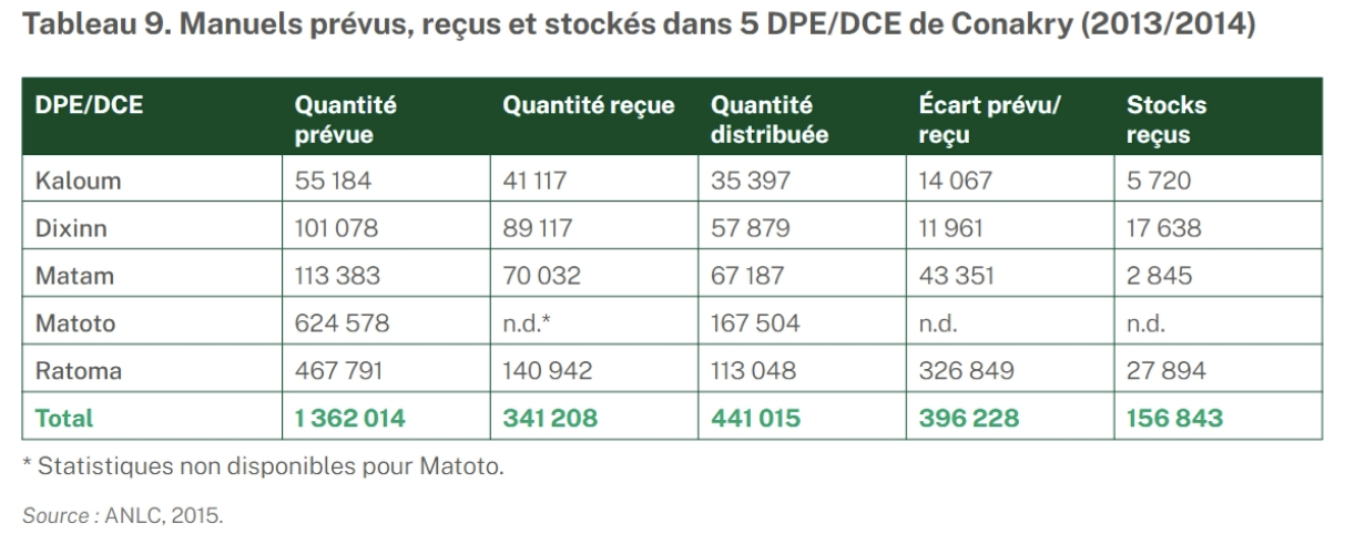 Au niveau secondaire, les maisons d’édition sont invitées à rédiger, imprimer et disséminer les manuels dans le cadre d’appels d’offres internationaux. La maison d’édition qui a en charge le marché est responsable de l’acheminement des manuels. Ces derniers sont expédiés selon la clé de répartition établie par région et par préfecture. Ils sont remis aux DPE/DCE, qui les livrent aux écoles et établissent des bordeaux de livraison. L’INRAP vérifie que les manuels sont parvenus à destination et signale les cas où les manuels sont restés en magasin. Une semaine après la rentrée scolaire, l’IGE supervise l’arrivée des manuels dans les écoles. Le rapport produit en 2015 sous l’égide de l’ANLC (ANLC, 2015) fait état d’« indices graves et concordants de fraude et corruption dans les marchés d’acquisition de manuels scolaires » (voir Encadré 9). Ce rapport porte sur les six millions de manuels scolaires en calcul, français, sciences de l’observation, éducation civique et morale et histoire-géographie mis à disposition des écoles primaires pour l’année 2012/2013, et financés par le Fonds commun de la Banque mondiale et de l’Agence française de développement. Selon l’enquête réalisée dans cinq DPE/DCE de la ville de Conakry, sur 1 362 014 manuels prévus, 441 015 ont été effectivement distribués – soit un tiers seulement (voir Tableau 9). Une telle différence s’explique en partie par la différence entre le nombre de manuels prévus et reçus, ainsi que par le nombre de manuels conservés dans les stocks. Dans ses conclusions, le rapport dénonce l’absence de contrôle du respect des clauses des contrats passés avec les maisons d’édition et imprimeries ainsi que le manque de contrôle des stocks à tous les niveaux du système, des magasins aux écoles. Elle recommande de ne pas produire de nouveaux manuels, dans la mesure où ils sont stockés en nombre suffisant pour répondre non seulement aux besoins des écoles publiques, mais aussi des écoles privées, ainsi que de créer une commission chargée de la récupération des manuels scolaires en vente illicite sur le marché.