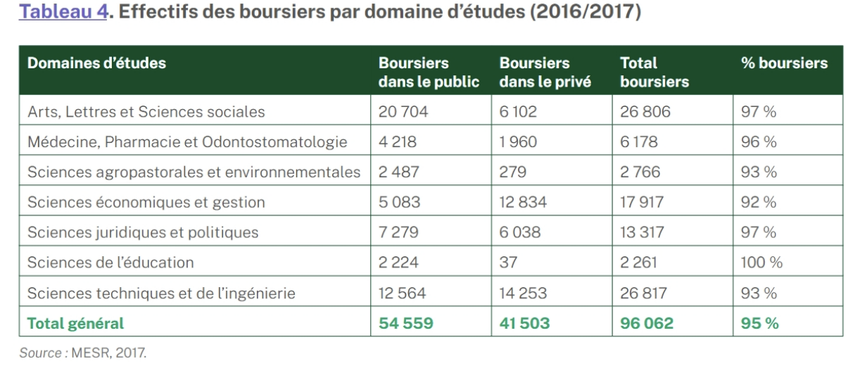 Selon les chiffres de 2017 communiqués par le MESR, les étudiants boursiers étaient au nombre de 96 062 (soit 95 % des étudiants) en 2016/2017. Le montant des bourses représentait près des deux tiers de la totalité des dépenses courantes affectées au supérieur en 2016. Ils se répartissaient entre 54 559 boursiers scolarisés dans les universités publiques et 41 503 boursiers dans les universités privées. Cette situation faisait suite à la décision prise par l’État en 2006 d’accorder des bourses aux étudiants du privé afin de favoriser l’accès à l’enseignement supérieur dans un contexte de faible capacité d’accueil des établissements publics. Ce système de financement a été suspendu depuis la rentrée 2017/2018 du fait de coûts trop élevés, ce qui a réduit le nombre d’étudiants du privé et le nombre d’étudiants globalement.