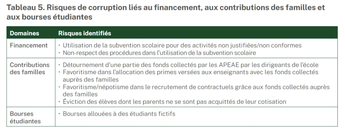 Le Tableau 5 récapitule les principaux risques de corruption liés au financement, aux contributions des élèves et aux bourses étudiantes.