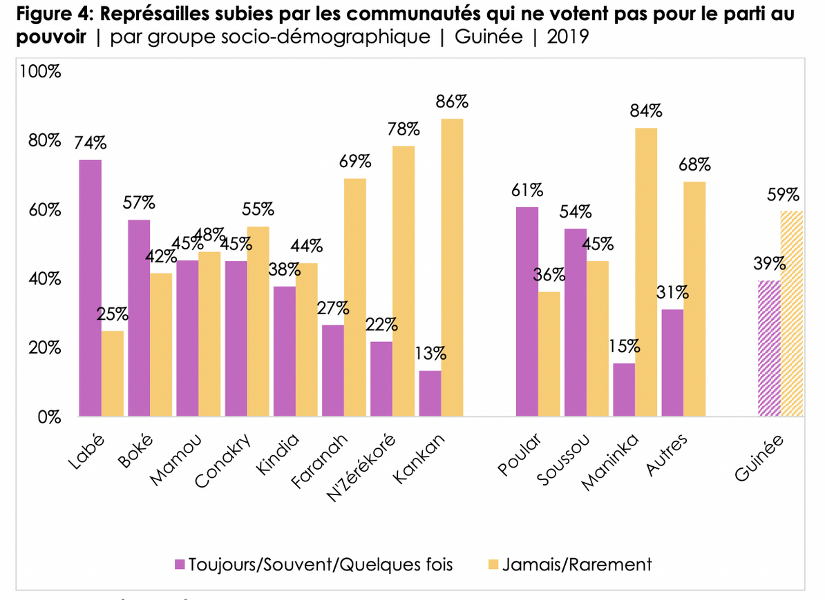 Pour quatre Guinéens sur 10 (39%), les communautés qui ne votent pas pour le parti au pouvoir souffrent « quelquefois », « souvent », ou « toujours » de conséquences négatives telles que le manque de soutien du gouvernement pour les services locaux ou les projets de développement. Ce point de vue est partagé par la majorité des répondants vivant dans les régions de Labé (74%) et de Boké (57%)