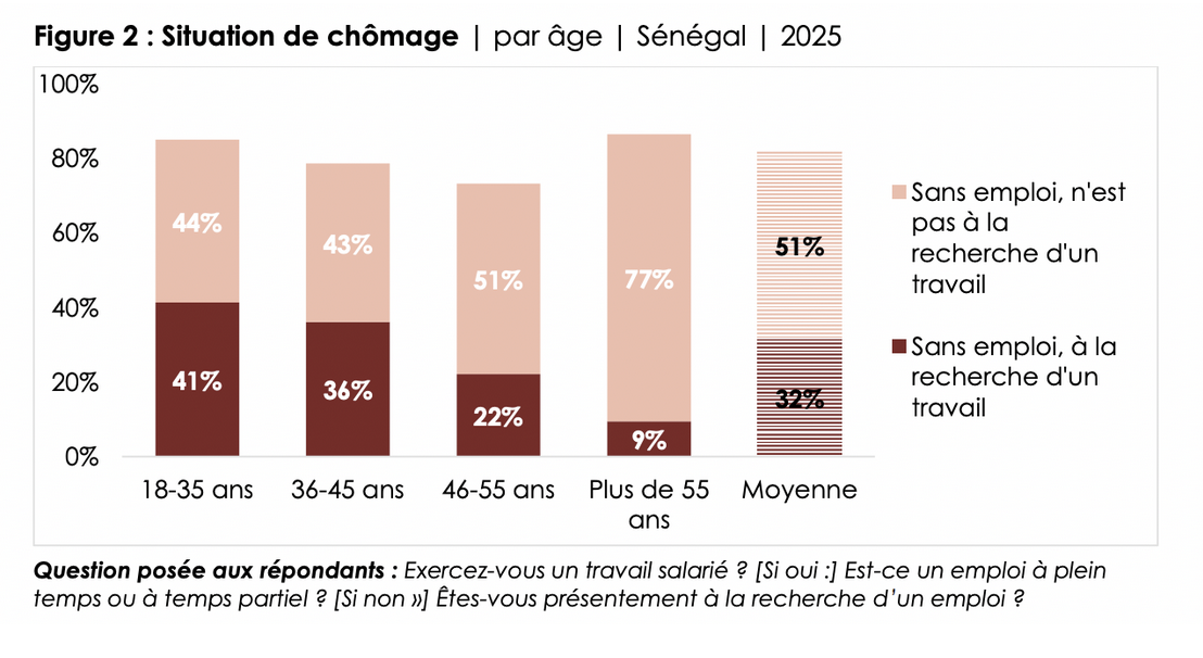 Si les jeunes sénégalais sont plus instruits que leurs aînés, ils sont cependant moins susceptibles d’avoir un emploi (Figure 2). Quatre jeunes sur 10 (41%) déclarent être au chômage et rechercher activement un emploi, contre 22%-36% des personnes d’âge moyen (36-55 ans). Parmi les jeunes chômeurs à la recherche d’un emploi, 9% se déclarent étudiants, tandis que parmi les 41% des jeunes sans emploi et ne cherchant pas activement du travail, 11% se disent étudiants.