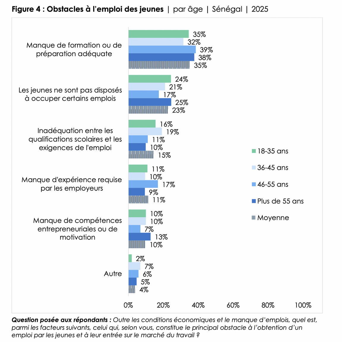 Le chômage des jeunes est un problème complexe lié à une multitude de facteurs économiques. Mais outre la situation économique générale du pays et la pénurie d’emplois, existe-t-il d’autres obstacles qui empêchent les jeunes de trouver un emploi ? Comme leurs aînés, les jeunes sénégalais sont les plus susceptibles de considérer le manque de formation ou de préparation adéquate comme un obstacle à l’emploi des jeunes (cité par 35% des jeunes répondants (Figure 4). Un quart des jeunes interrogés (24%) estiment que leurs pairs ne sont pas disposés à accepter certains types d’emplois, 16% soulignent l’inadéquation entre qualifications académiques et critères d’embauche, 11% l’insuffisance d’expérience pratique exigée par les employeurs et 10% le manque de compétences entrepreneuriales ou de motivation.