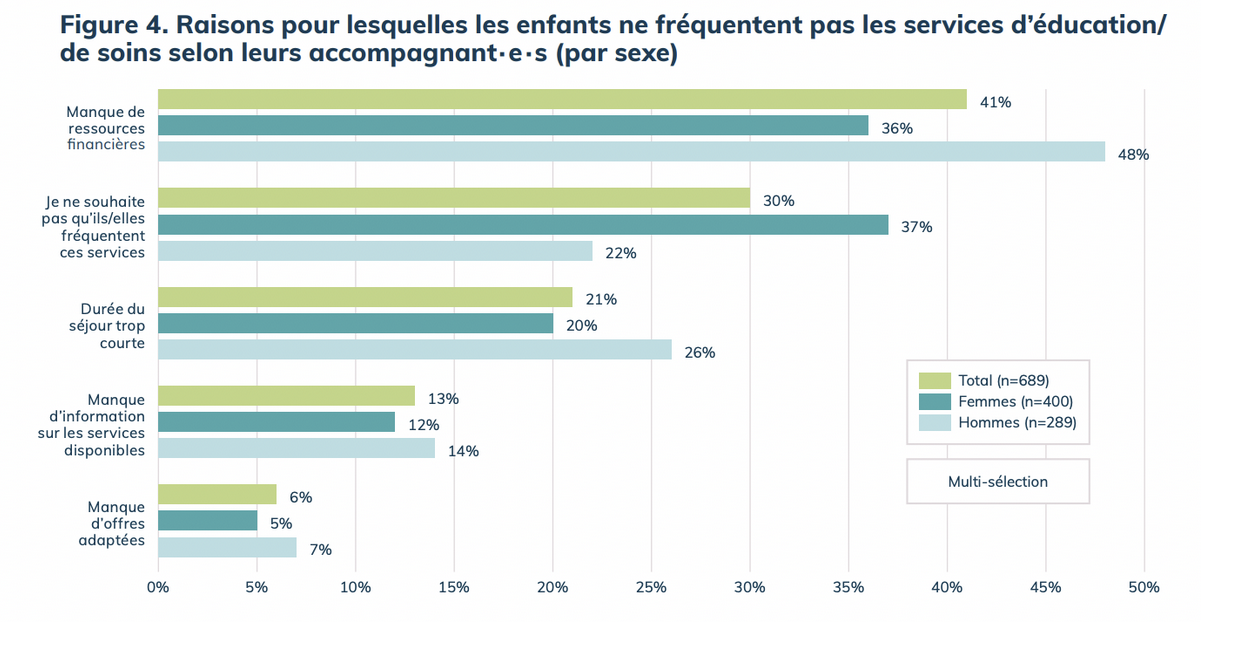Le manque de ressources financières est le principal obstacle rencontré par les accompagnant∙e∙s qui formulent un besoin éducatif pour les enfants à leur charge sans pouvoir accéder aux services d’éducation. Parmi les accompagnant∙e∙s interrogé∙e∙s qui formulent le besoin, pour leur enfant, d’accéder à une éducation formelle ou informelle (n=347), la moitié (51%) indique que les enfants à leur charge ne fréquentent aucun service éducatif et/ou de garde d’enfant.